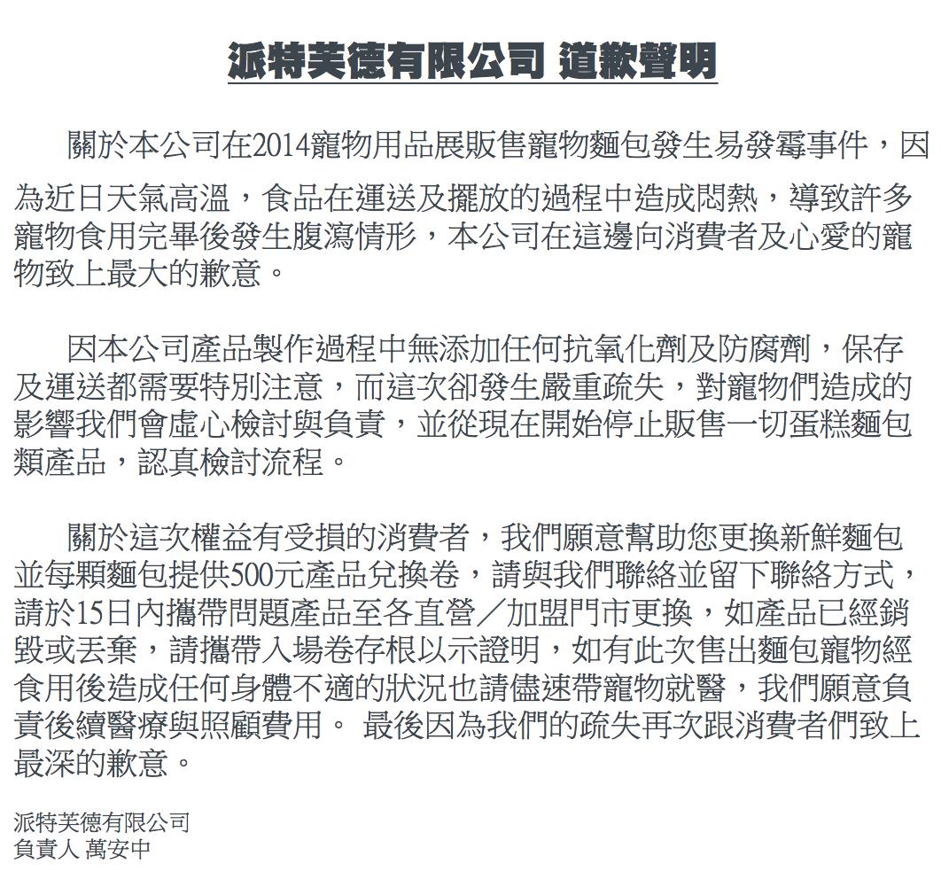 知名的寵物食品商「派特芙德」(Pet & Food)遭民眾爆料,販售的寵物麵包發霉了!家裡狗狗嗷嗚哀嚎不停,還拼命拉肚子。去粉絲團留言後才發現,原來大家都遇到一樣的事,有民眾痛批這根本是草菅狗命。派特芙德負責人 萬安中表示,他們的食物保存流程確實出問題;為了表示歉意,除了麵包免費換新,他們也提供每顆麵包500元的產品兌換券、負擔一切寵物醫藥費。