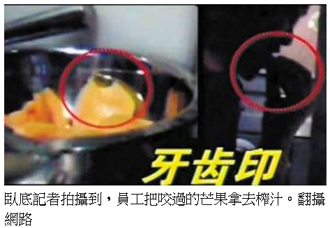 報導指出,臥底記者經潛伏半個月後發現,該店的餐具不僅從未被消毒過,還被員工用刷過鞋的刷子刷洗,芒果汁則是用被員工咬過或已腐爛的芒果,經簡單處理後榨成,員工還將過期產品的標簽撕掉,後重新出售。