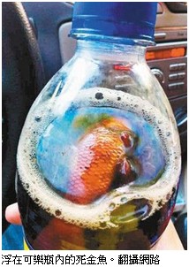 中國西安溫姓女子,上月4日在當地超市買了2瓶600毫升裝的百事可樂寶特瓶,回家打開一瓶就往嘴裡灌,喝下第一口覺得味道很怪,仔細一看發現瓶內似乎有個紅色物品漂浮著,居然是一條死掉的金魚!溫姓女子立刻反胃大吐,並用手機拍下照片,上傳到網路。