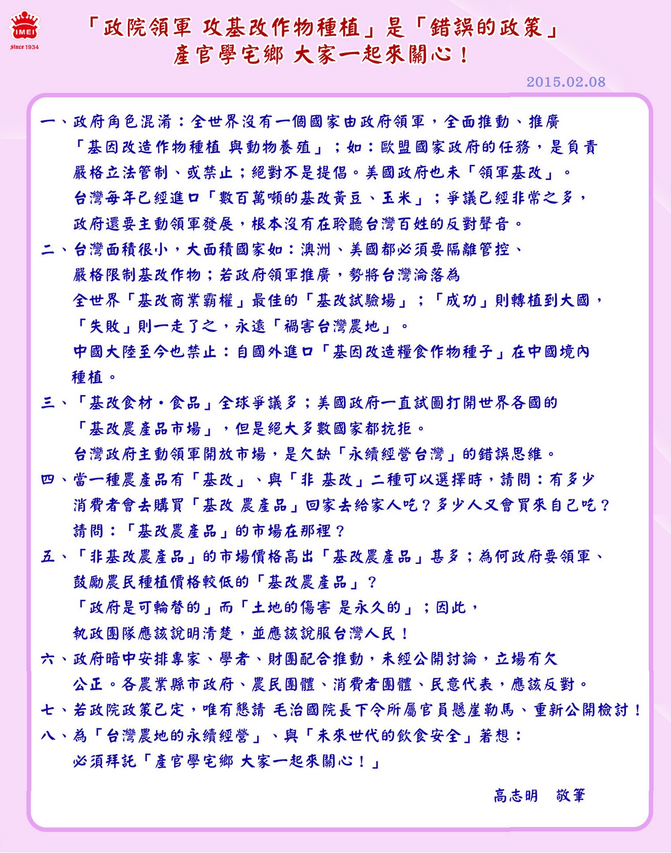 我們難道就僅以「吃了不會死」這樣的標準來看待引以自豪的食品產業?環境生態、健康風險、公平正義的價值全都不需考慮了?全世界都追求生態經濟綠色產業的現今,全面採用非基改原料,才是台灣能再創新一波食品風華的實際作為