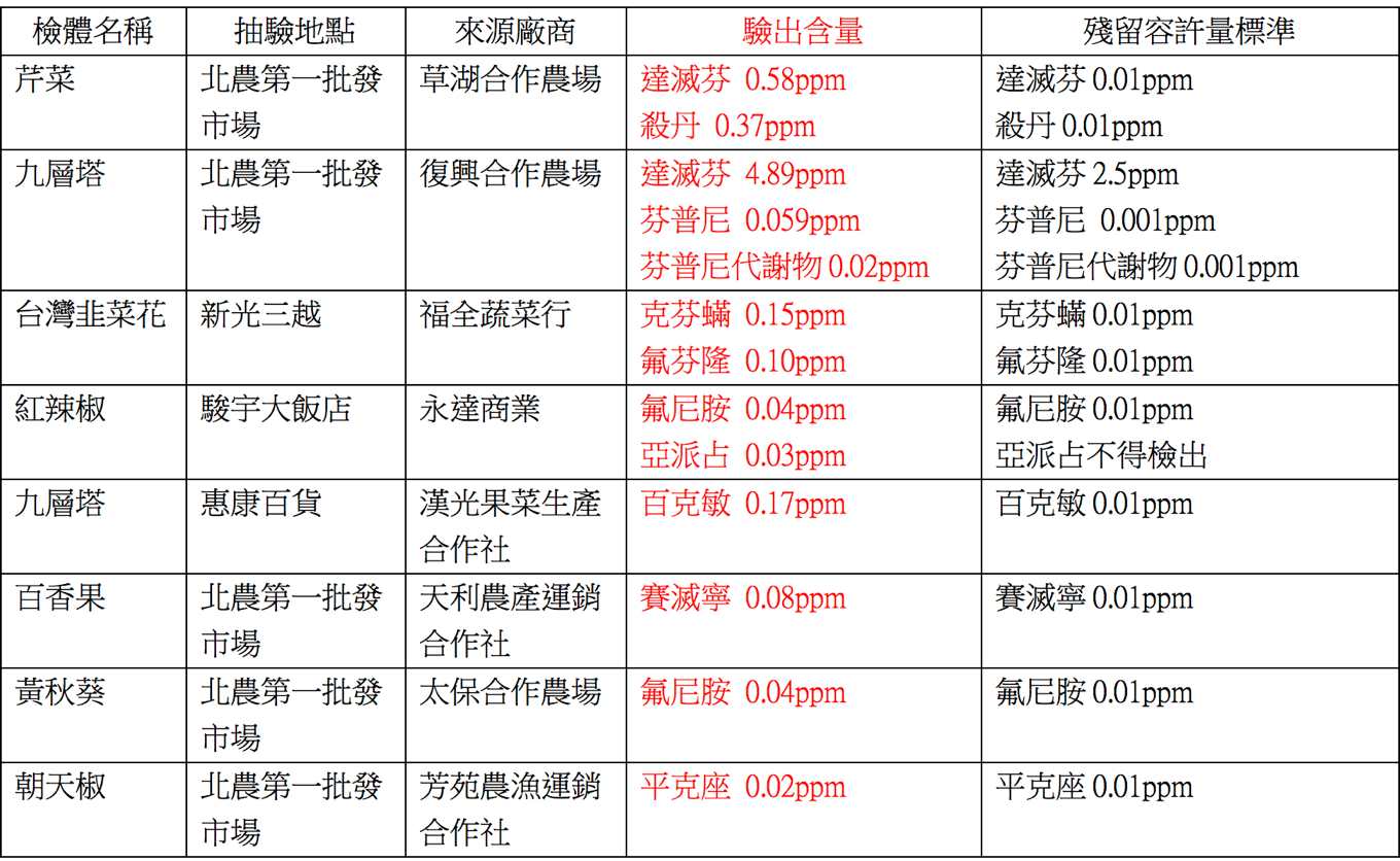 新光三越超市的韭菜花、惠康百貨的九層塔都分別被驗出超標農藥,駿宇大飯店的紅辣椒也驗到不得檢出的殺菌劑亞派占。