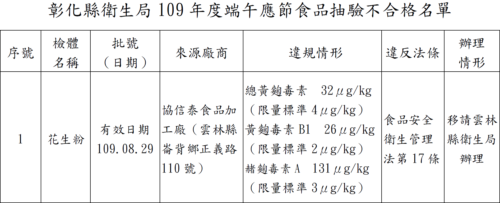 彰化縣衛生局公布第1波端午應節食品抽驗結果,1件花生粉真菌毒素超量不合格 2020-07-132020-06-17 作者: iQC 端午節將屆,為維護民眾食品衛生安全,彰化縣衛生局近日稽查粽子製造場所、生鮮超市、大賣場、南北雜貨店、傳統市 … 閱讀全文